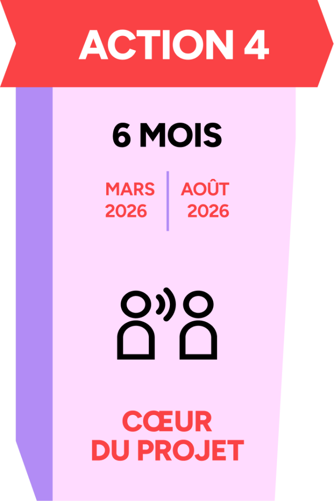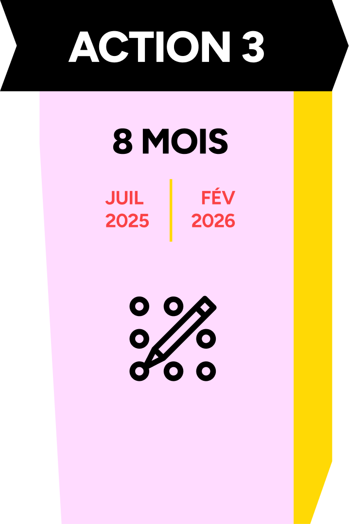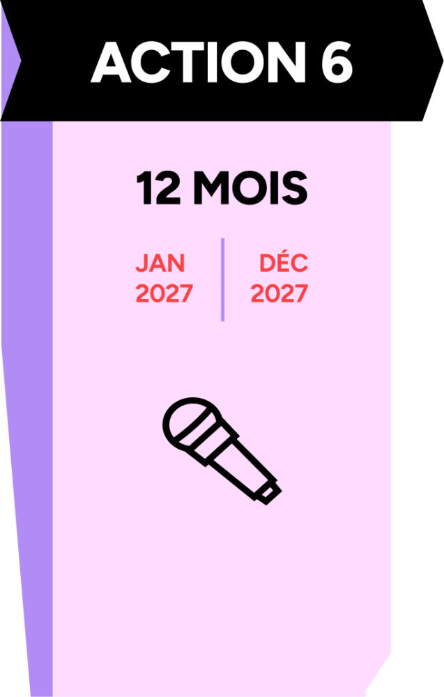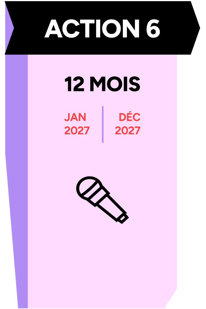 Pour mener ces 2 phases ce sont au total 6 « Actions » programmées sur une durée de 36 mois qui donneront lieu à des partages réguliers à destination du secteur dans une intention d’information, d’inspiration et de plaidoyer. Le découpage dans le temps de ces Actions est en partie théorique : en pratique et dans l’intérêt du projet les unes ou les autres pourront se chevaucher pour s’adapter à la réalité des calendriers de tournées.